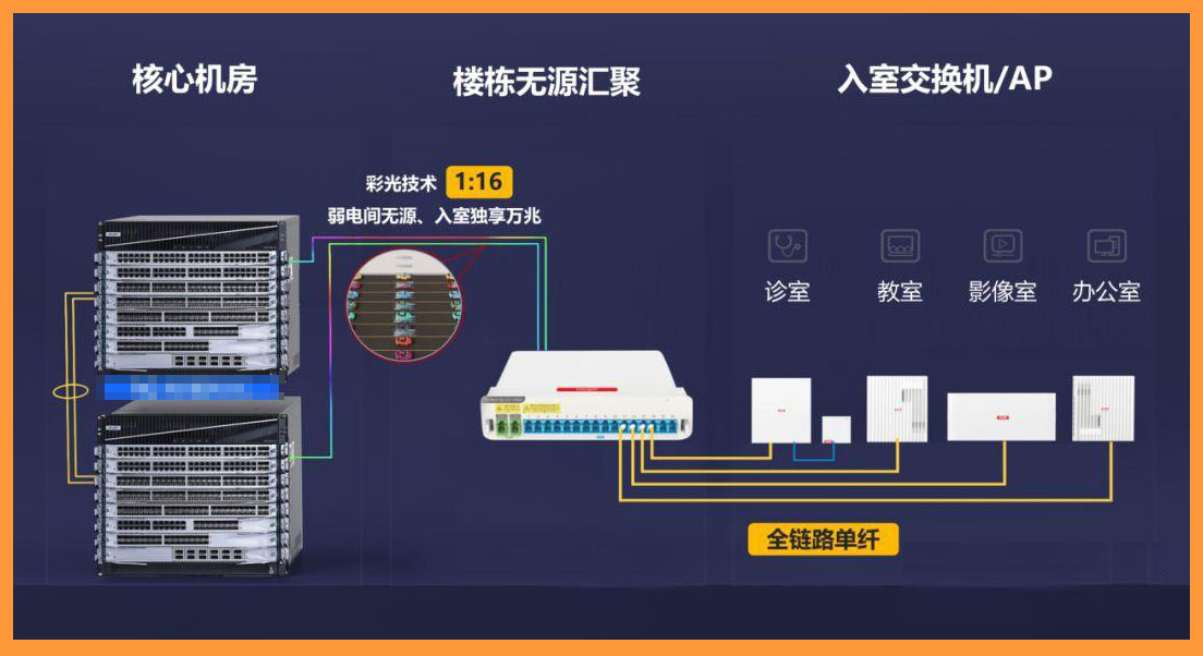 架構極簡:通過光纖直達終端,減少中間鏈路與設備,弱電間僅需極簡部署,降低空間與能耗需求。